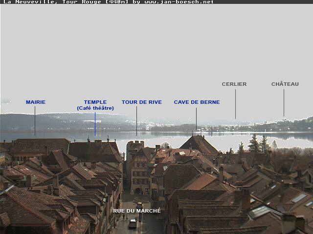 Il s'agit d'une caméra professionnelle extérieure entièrement autonome (sauf alimentation électrique), raccordée à mon réseau privé. L'appareil transmet des photos de La Neuveville toutes les 5 minutes et les publie directement sur mon site web. Une autre image est également archivée toutes les 2 minutes sur le site web, permettant ainsi de créer une séquence animée ("stop motion" ; environ 200 MB d'images pour une année).